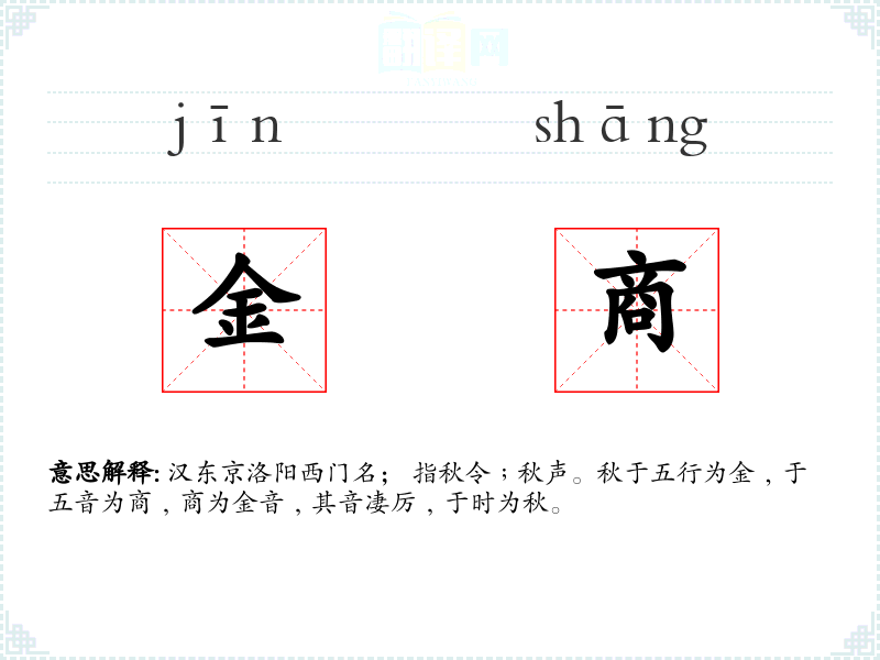 汉东京洛阳西门名; 指秋令﹔秋声。秋于五行为金﹐于五音为商﹐商为金音﹐其音凄厉﹐于时为秋。