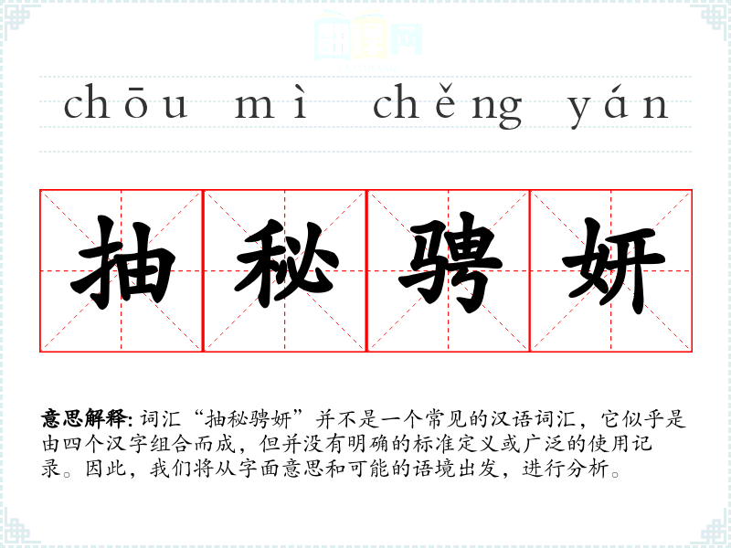 词汇“抽秘骋妍”并不是一个常见的汉语词汇,它似乎是由四个汉字组合而成,但并没有明确的标准定义或广泛的使用记录。因此,我们将从字面意思和可能的语境出发,进行分析。