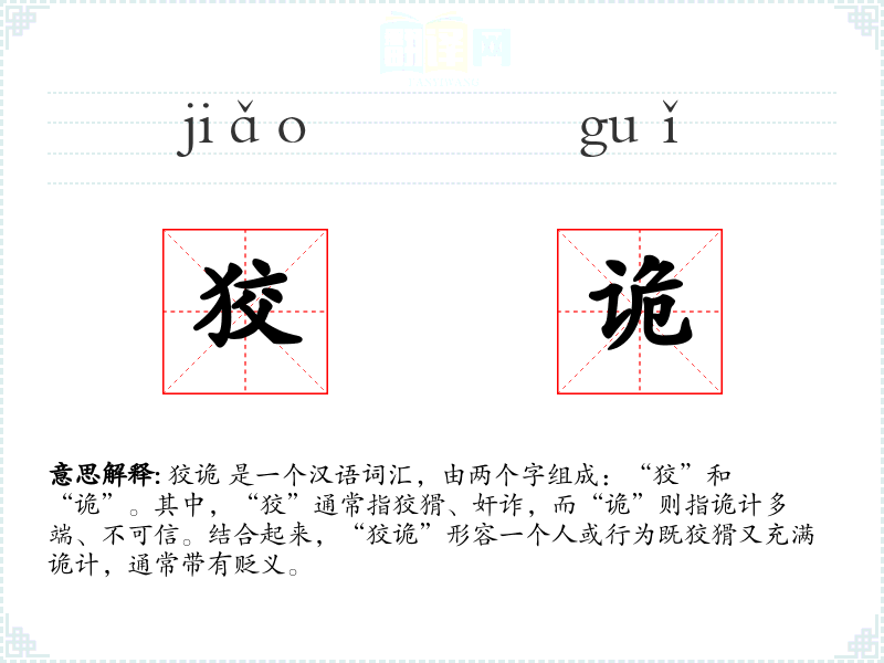 - 演变:随着时间的推移,这两个字结合在一起,形成了“狡诡”这个复合词,用来形容更加复杂和不可信的行为。