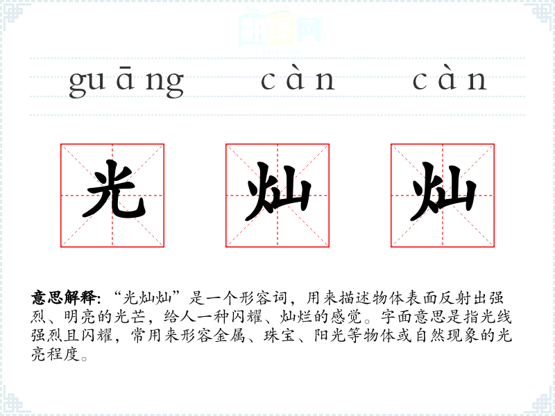 - 口语语境:在日常口语中,人们可能用“光灿灿”来形容阳光、水面等自然现象,表达其明亮和美丽。例如,“今天的阳光光灿灿的,让人心情大好。”