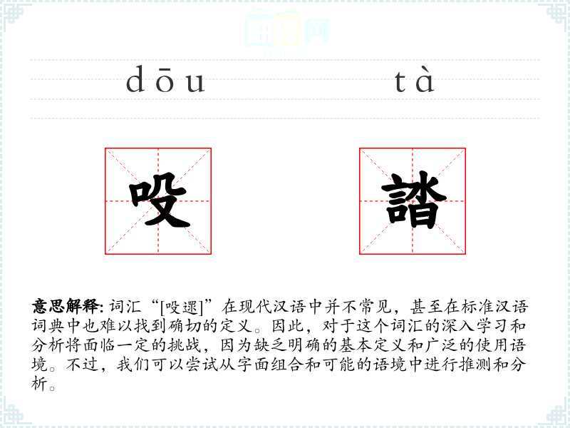 词汇“[吺遝]”在现代汉语中并不常见,甚至在标准汉语词典中也难以找到确切的定义。因此,对于这个词汇的深入学习和分析将面临一定的挑战,因为缺乏明确的基本定义和广泛的使用语境。不过,我们可以尝试从字面组合和可能的语境中进行推测和分析。
