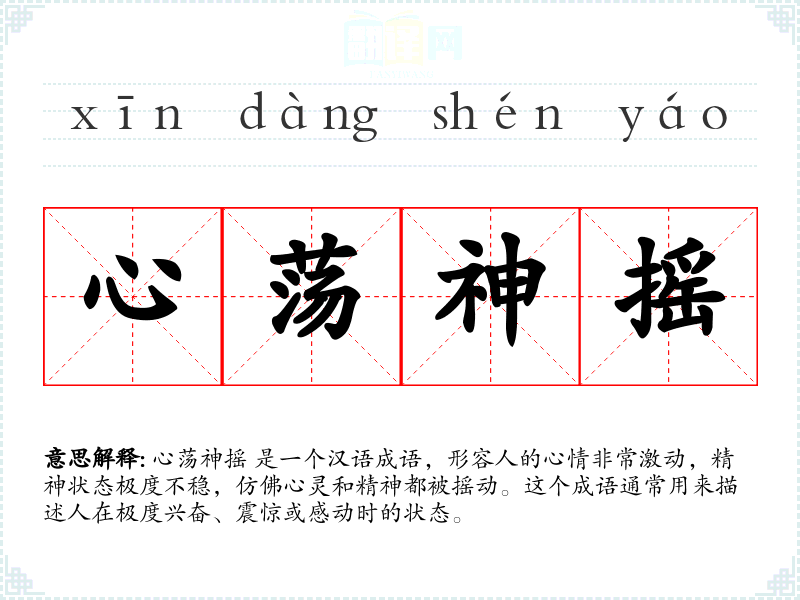 心荡神摇 是一个汉语成语,形容人的心情非常激动,精神状态极度不稳,仿佛心灵和精神都被摇动。这个成语通常用来描述人在极度兴奋、震惊或感动时的状态。