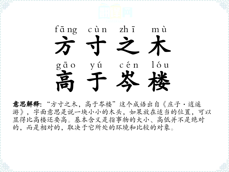 “方寸之木,高于岑楼”这个成语出自《庄子·逍遥游》,字面意思是说一块小小的木头,如果放在适当的位置,可以显得比高楼还要高。基本含义是指事物的大小、高低并不是绝对的,而是相对的,取决于它所处的环境和比较的对象。