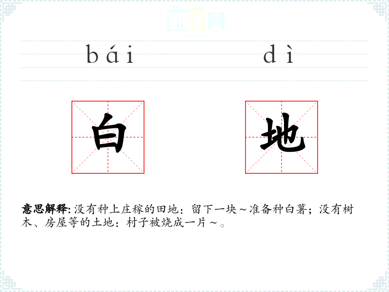 没有种上庄稼的田地:留下一块~准备种白薯;没有树木、房屋等的土地:村子被烧成一片~。