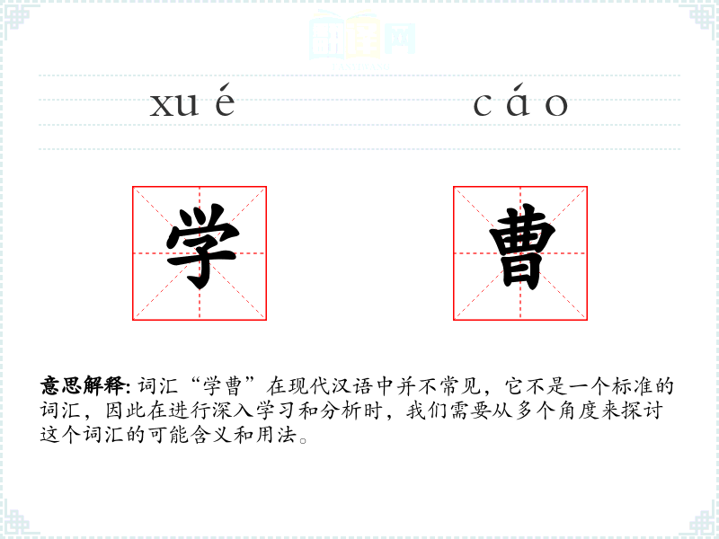 “学曹”这个词汇的字面意思并不明确,因为它不是一个标准的汉语词汇。如果强行解释,“学”可以理解为学或模仿,“曹”可能指代某个姓曹的人或与曹相关的概念。因此,“学曹”可能意味着学或模仿某位姓曹的人的行为、思想或风格。
