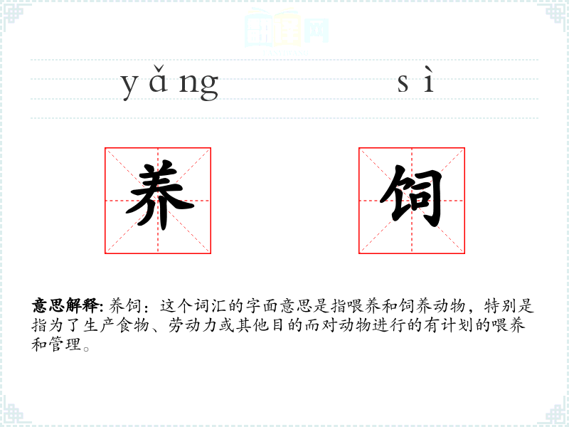 养饲:这个词汇的字面意思是指喂养和饲养动物,特别是指为了生产食物、劳动力或其他目的而对动物进行的有计划的喂养和管理。