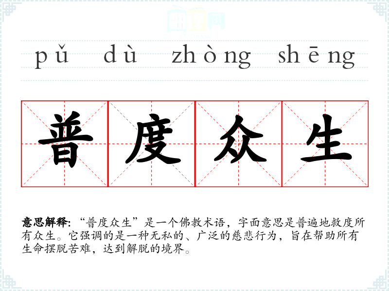 “普度众生”是一个**术语,字面意思是普遍地救度所有众生。它强调的是一种无私的、广泛的慈悲行为,旨在帮助所有生命摆脱苦难,达到解脱的境界。