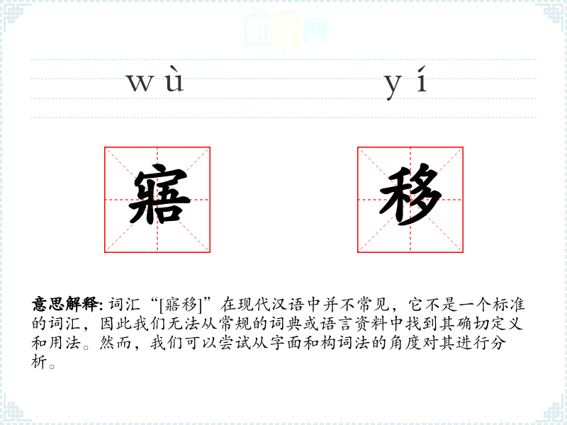 词汇“[寤移]”在现代汉语中并不常见,它不是一个标准的词汇,因此我们无法从常规的词典或语言资料中找到其确切定义和用法。然而,我们可以尝试从字面和构词法的角度对其进行分析。