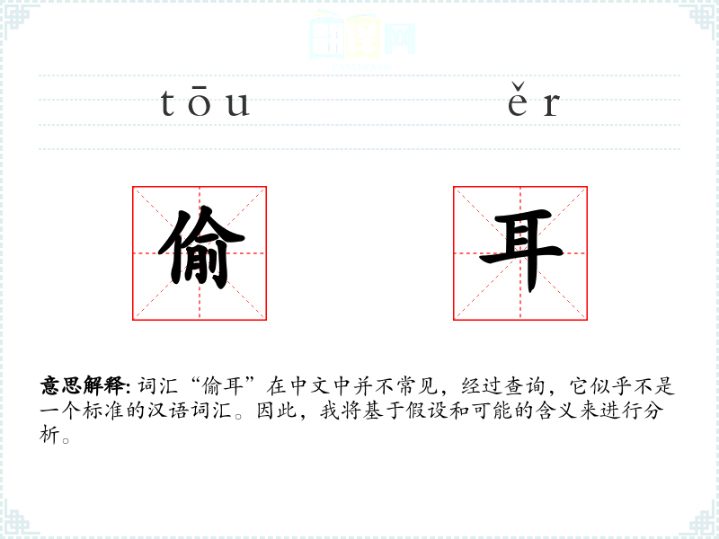 词汇“偷耳”在中文中并不常见,经过查询,它似乎不是一个标准的汉语词汇。因此,我将基于假设和可能的含义来进行分析。