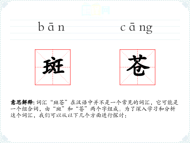 词汇“斑苍”在汉语中并不是一个常见的词汇,它可能是一个组合词,由“斑”和“苍”两个字组成。为了深入学习和分析这个词汇,我们可以从以下几个方面进行探讨: