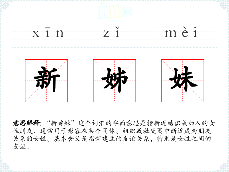“新姊妹”这个词汇的字面意思是指新近结识或加入的女性朋友,通常用于形容在某个团体、组织或社交圈中新近成为朋友关系的女性。基本含义是指新建立的友谊关系,特别是女性之间的友谊。