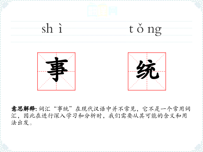 词汇“事统”在现代汉语中并不常见,它不是一个常用词汇,因此在进行深入学*和分析时,我们需要从其可能的含义和用法出发。