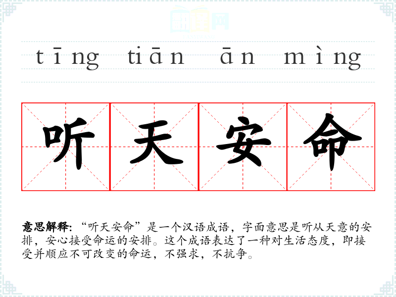 “听天安命”是一个汉语成语,字面意思是听从天意的安排,安心接受命运的安排。这个成语表达了一种对生活态度,即接受并顺应不可改变的命运,不强求,不抗争。