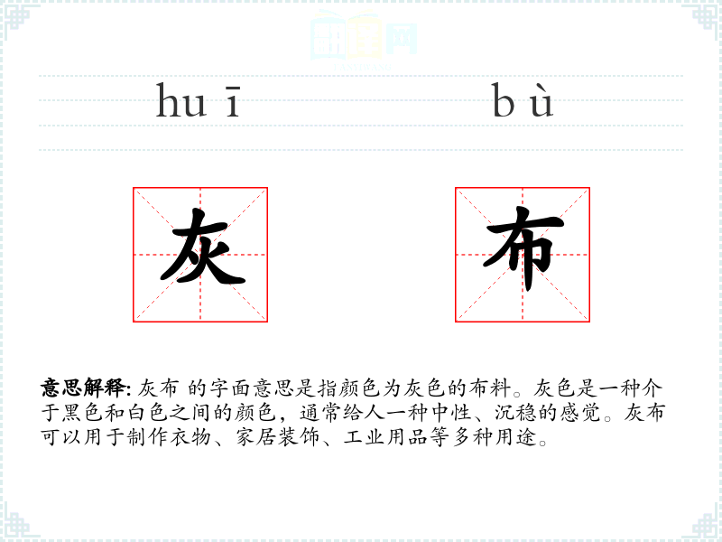 - 同义词:灰布的同义词包括灰色布料、灰布料等。