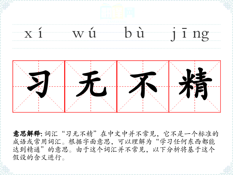 词汇“习无不精”在中文中并不常见,它不是一个标准的成语或常用词汇。根据字面意思,可以理解为“学习任何东西都能达到精通”的意思。由于这个词汇并不常见,以下分析将基于这个假设的含义进行。