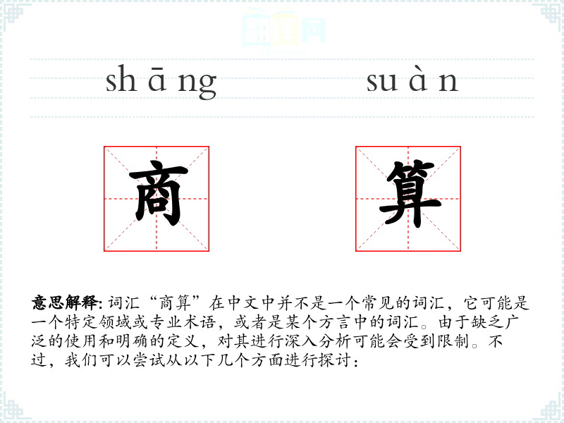 词汇“商算”在中文中并不是一个常见的词汇,它可能是一个特定领域或专业术语,或者是某个方言中的词汇。由于缺乏广泛的使用和明确的定义,对其进行深入分析可能会受到限制。不过,我们可以尝试从以下几个方面进行探讨: