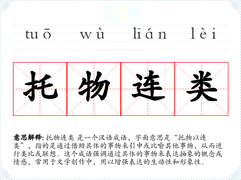 托物连类 是一个汉语成语,字面意思是“托物以连类”,指的是通过借助具体的事物来引申或比喻其他事物,从而进行类比或联想。这个成语强调通过具体的事物来表达抽象的概念或情感,常用于文学创作中,用以增强表达的生动性和形象性。