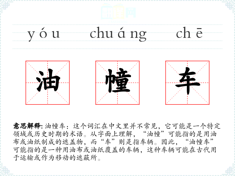 油幢车:这个词汇在中文里并不常见,它可能是一个特定领域或历史时期的术语。从字面上理解,“油幢”可能指的是用油布或油纸制成的遮盖物,而“车”则是指车辆。因此,“油幢车”可能指的是一种用油布或油纸覆盖的车辆,这种车辆可能在古代用于运输或作为移动的遮蔽所。