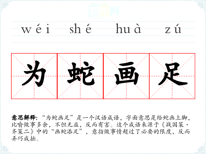 “为蛇画足”源自“画蛇添足”,这个成语最早出现在《战国策》中,讲述了一个关于画蛇比赛的故事,其中一人为了显示自己的技艺,给蛇画上了脚,结果反而失去了胜利。随着时间的推移,这个成语被广泛用于各种语境,强调做事要适度,避免过度。
