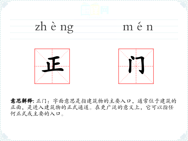 正门:字面意思是指建筑物的主要入口,通常位于建筑的正面,是进入建筑物的正式通道。在更广泛的意义上,它可以指任何正式或主要的入口。