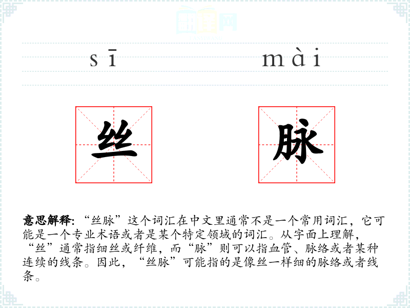 “丝脉”这个词汇在中文里通常不是一个常用词汇,它可能是一个专业术语或者是某个特定领域的词汇。从字面上理解,“丝”通常指细丝或纤维,而“脉”则可以指血管、脉络或者某种连续的线条。因此,“丝脉”可能指的是像丝一样细的脉络或者线条。