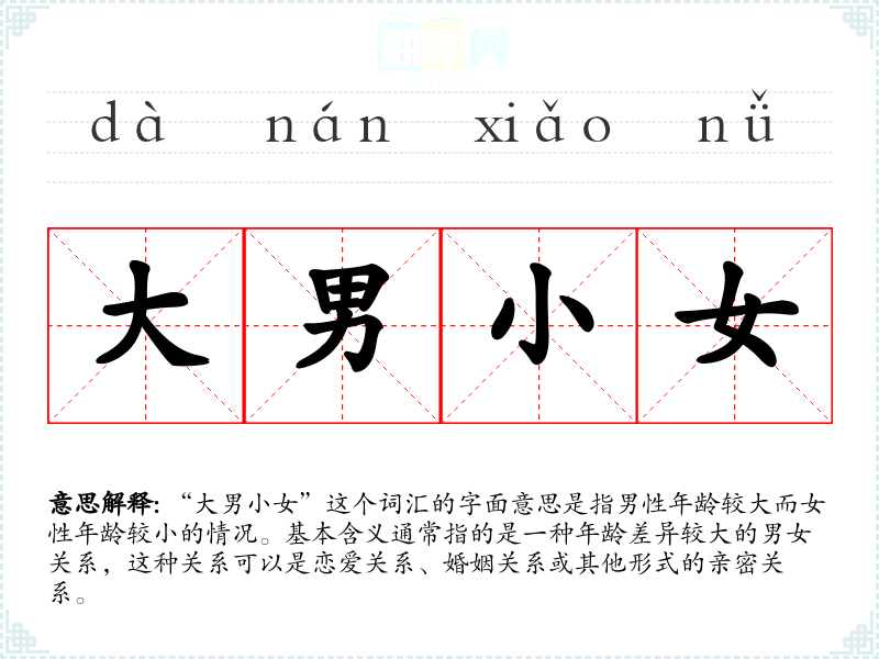 “大男小女”这个词汇的字面意思是指男性年龄较大而女性年龄较小的情况。基本含义通常指的是一种年龄差异较大的男女关系,这种关系可以是恋爱关系、婚姻关系或其他形式的亲密关系。