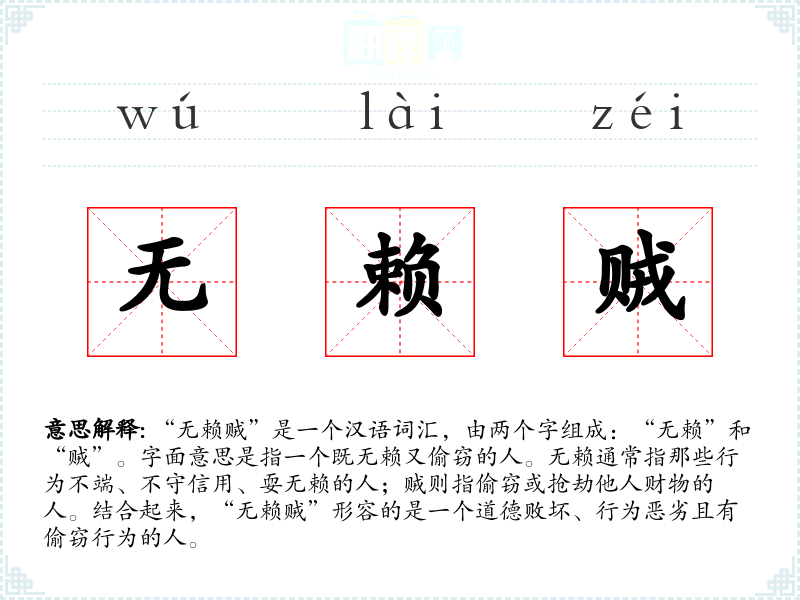 “无赖”一词最早见于《汉书》,原指无依靠、无赖以生的人,后逐渐演变为形容品行不端的人。“贼”字古已有之,指偷窃者。两者结合,形成了“无赖贼”这一复合词,用以形容那些品行极差且有偷窃行为的人。