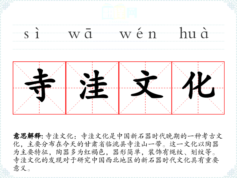 同义词:寺洼遗址、寺洼类型(在考古学中指代同一文化) 反义词:现代文化(与古老的新石器时代文化相对)
