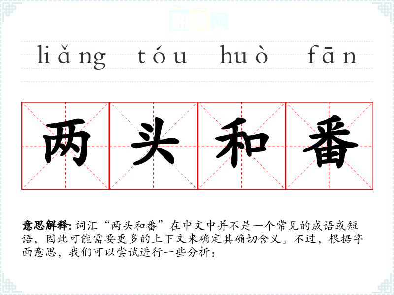 尽管“两头和番”不是一个常见的词汇,但它体现了语言中描述和解与和谐的一种可能性。在语言学习和表达中,了解这样的词汇可以丰富我们的表达方式,尽管在实际使用中可能需要更多的上下文来确保准确性。