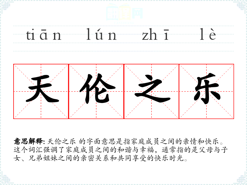 天伦之乐 的字面意思是指家庭成员之间的亲情和快乐。这个词汇强调了家庭成员之间的和谐与幸福,通常指的是父母与子女、兄弟姐妹之间的亲密关系和共同享受的快乐时光。