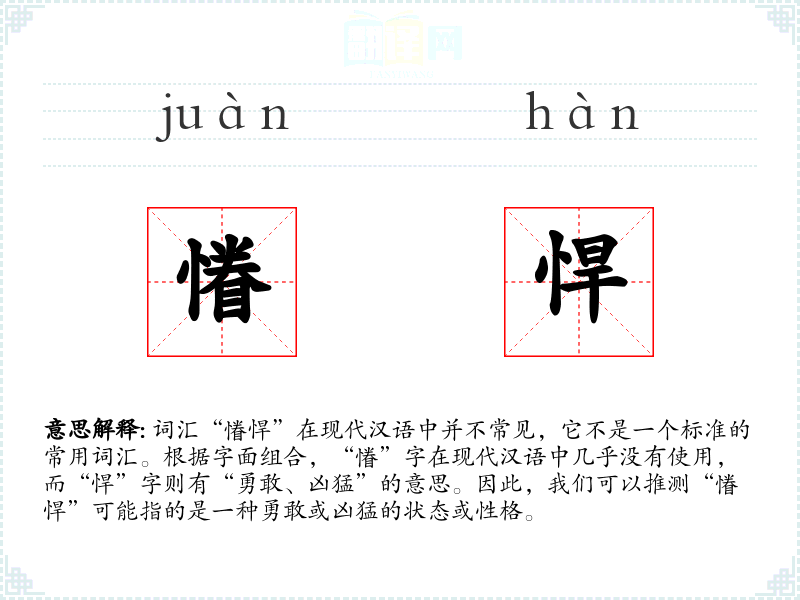 由于“慻”字不常用,我们无法给出一个确切的定义。如果强行解释,“慻悍”可能指的是一种极端的勇敢或凶猛,但这种解释缺乏权威性和实际应用的证据。