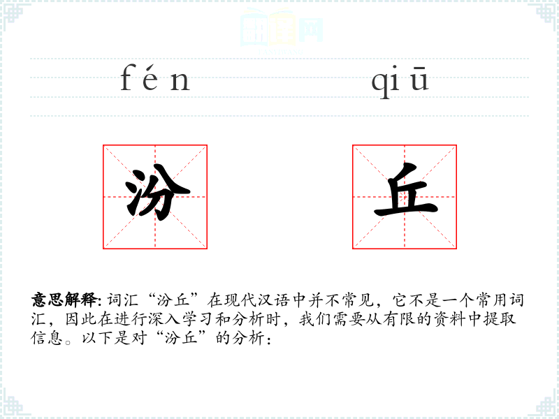词汇“汾丘”在现代汉语中并不常见,它不是一个常用词汇,因此在进行深入学*和分析时,我们需要从有限的资料中提取信息。以下是对“汾丘”的分析: