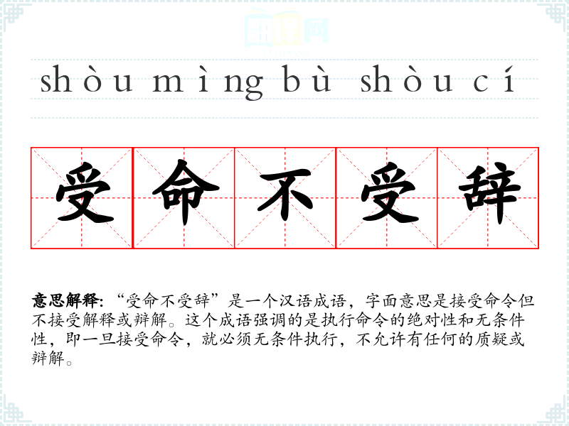 “受命不受辞”是一个汉语成语,字面意思是接受命令但不接受解释或辩解。这个成语强调的是执行命令的绝对性和无条件性,即一旦接受命令,就必须无条件执行,不允许有任何的质疑或辩解。