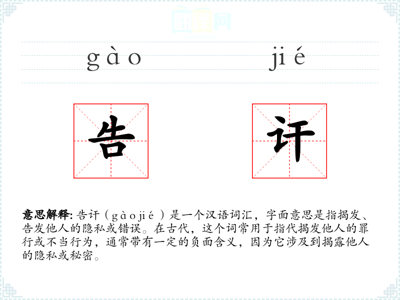 告讦(gào jié)是一个汉语词汇,字面意思是指揭发、告发他人的隐私或错误。在古代,这个词常用于指代揭发他人的罪行或不当行为,通常带有一定的负面含义,因为它涉及到揭露他人的隐私或秘密。