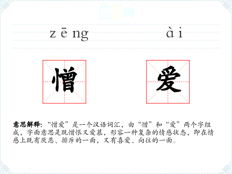 “憎爱”是一个汉语词汇,由“憎”和“爱”两个字组成,字面意思是既憎恨又爱慕,形容一种复杂的情感状态,即在情感上既有厌恶、排斥的一面,又有喜爱、向往的一面。