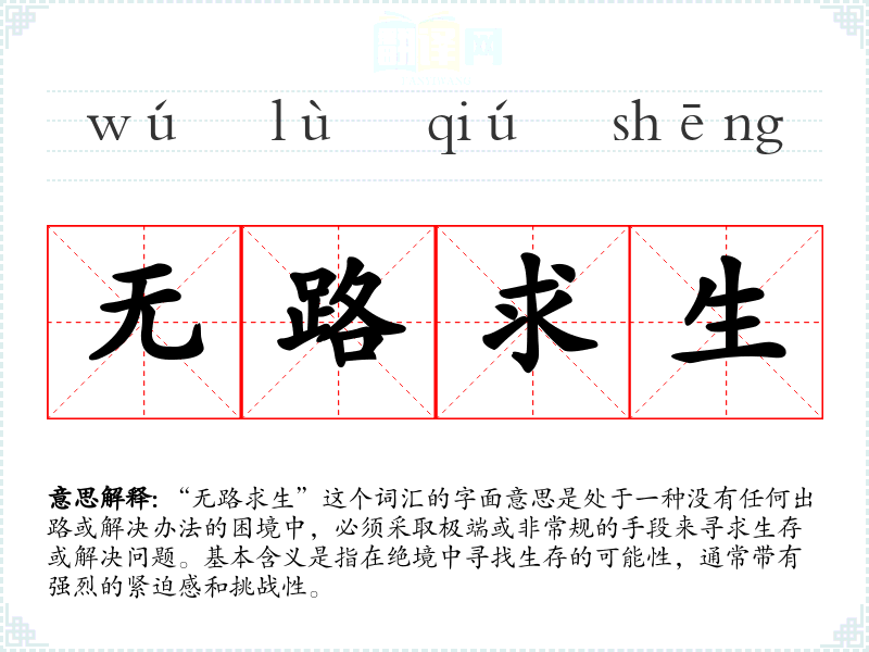 “无路求生”这个词汇的字面意思是处于一种没有任何出路或解决办法的困境中,必须采取极端或非常规的手段来寻求生存或解决问题。基本含义是指在绝境中寻找生存的可能性,通常带有强烈的紧迫感和挑战性。