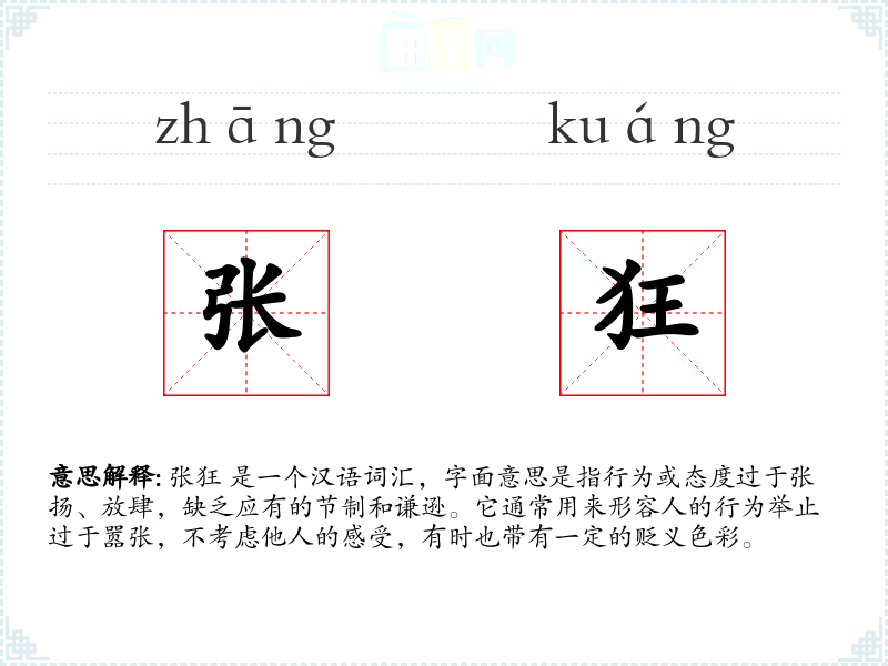 张狂 是一个汉语词汇,字面意思是指行为或态度过于张扬、放肆,缺乏应有的节制和谦逊。它通常用来形容人的行为举止过于嚣张,不考虑他人的感受,有时也带有一定的贬义色彩。