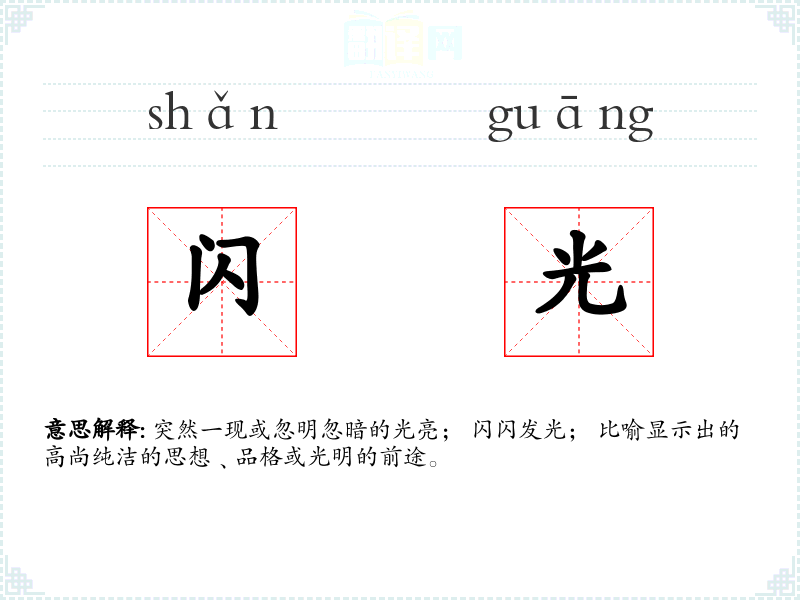 突然一现或忽明忽暗的光亮; 闪闪发光; 比喻显示出的高尚纯洁的思想﹑品格或光明的前途。