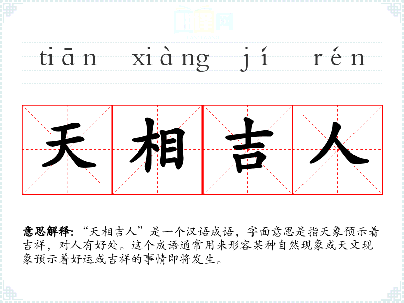 “天相吉人”是一个汉语成语,字面意思是指天象预示着吉祥,对人有好处。这个成语通常用来形容某种自然现象或天文现象预示着好运或吉祥的事情即将发生。