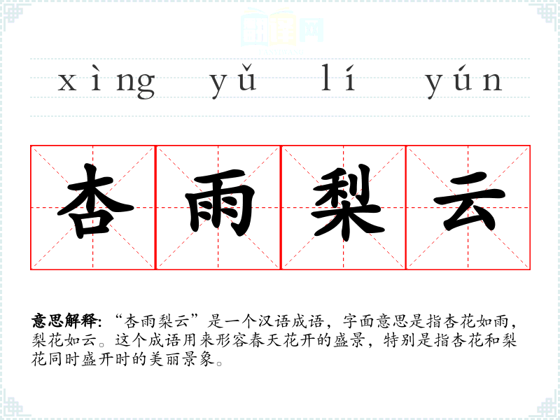 “杏雨梨云”是一个汉语成语,字面意思是指杏花如雨,梨花如云。这个成语用来形容春天花开的盛景,特别是指杏花和梨花同时盛开时的美丽景象。