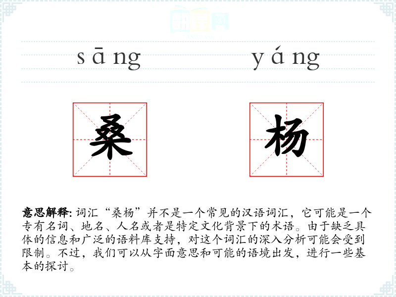 由于“桑杨”不是一个常见的词汇,对其的分析受到限制。如果它是一个特定语境下的词汇,那么它的意义和使用将由该语境来定义。在语言学*和表达中,了解特定词汇的语境和背景是非常重要的。