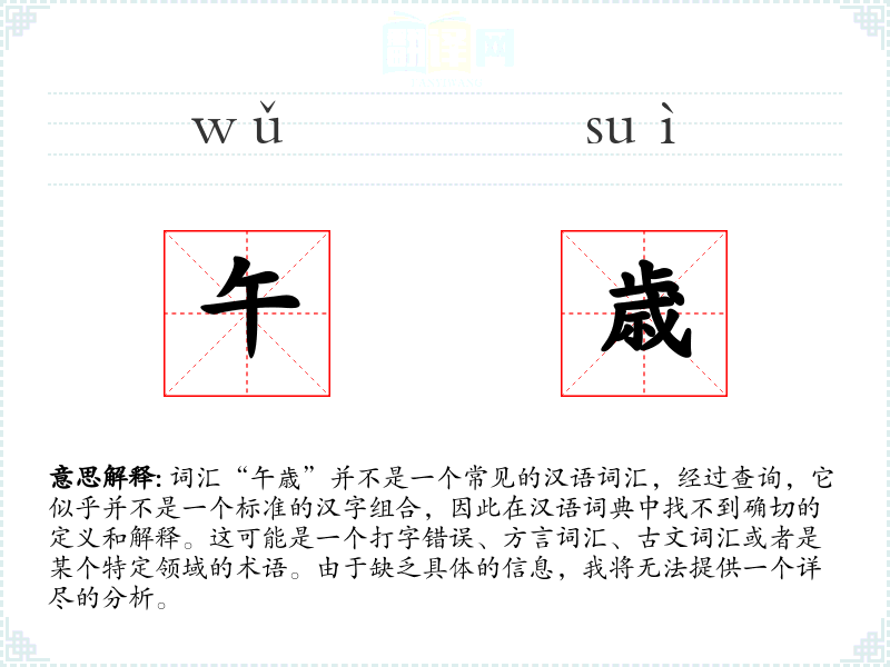 结合这两个字,如果我们强行解释,“午歳”可能指的是与中午或午时相关的年龄或年份,但这只是一个非常牵强的解释,实际上并没有这样的词汇。