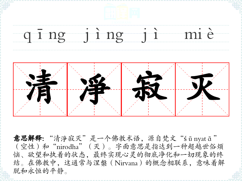 “清淨寂灭”是一个术语,源自梵文“śūnyatā”(空性)和“nirodha”(灭)。字面意思是指达到一种超越世俗烦恼、欲望和执着的状态,最终实现心灵的彻底净化和一切现象的终结。在中,这通常与涅槃(Nirvana)的概念相联系,意味着解脱和永恒的平静。