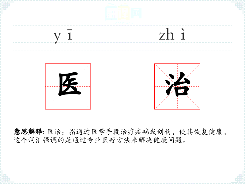 医治:指通过医学手段治疗疾病或创伤,使其恢复健康。这个词汇强调的是通过专业医疗方法来解决健康问题。