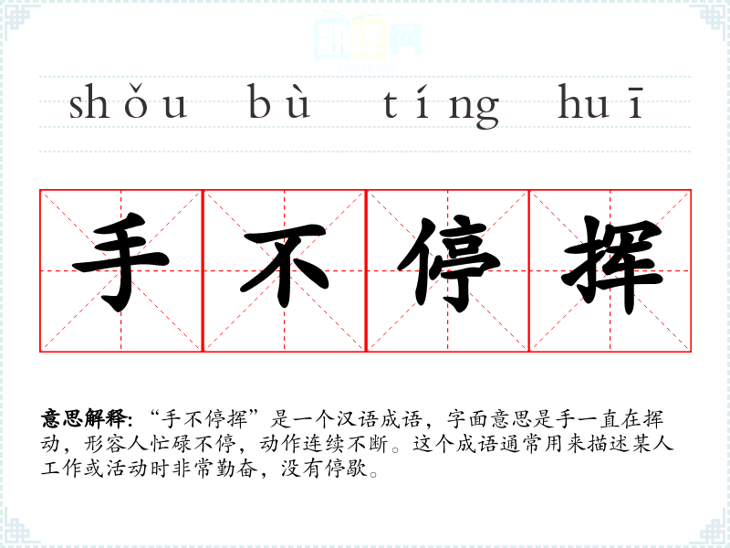 “手不停挥”是一个汉语成语,字面意思是手一直在挥动,形容人忙碌不停,动作连续不断。这个成语通常用来描述某人工作或活动时非常勤奋,没有停歇。