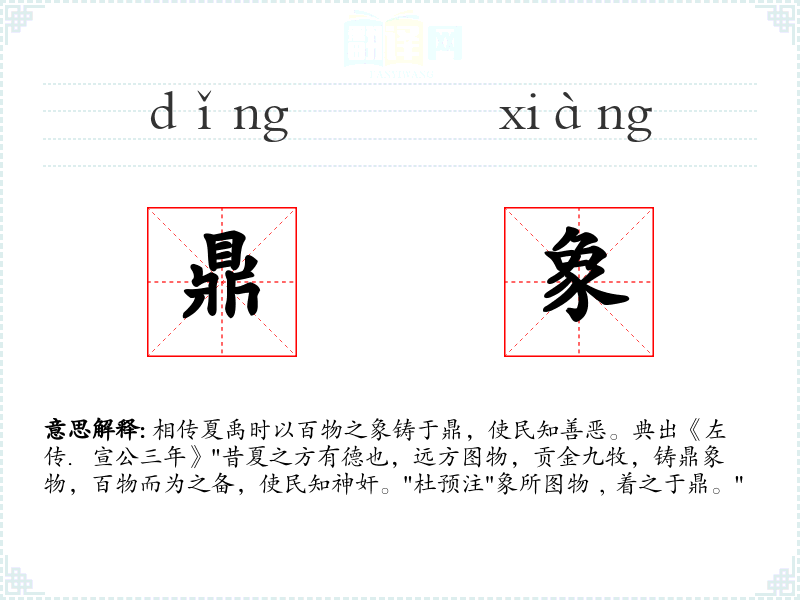 ,百物而为之备,使民知神奸。"杜预注"象所图物﹐着之于鼎。"