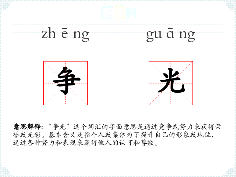 “争光”这个词汇源于汉语,由“争”和“光”两个字组成。在古代汉语中,“争”意味着竞争或争夺,“光”则指光彩或荣誉。随着时间的推移,这个词汇的含义逐渐固定为通过竞争获得荣誉。