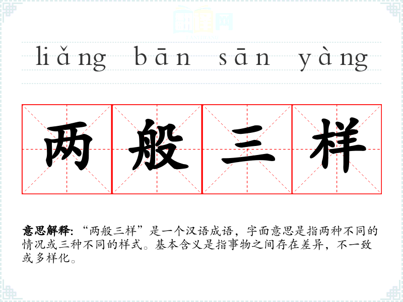 “两般三样”是一个汉语成语,字面意思是指两种不同的情况或三种不同的样式。基本含义是指事物之间存在差异,不一致或多样化。