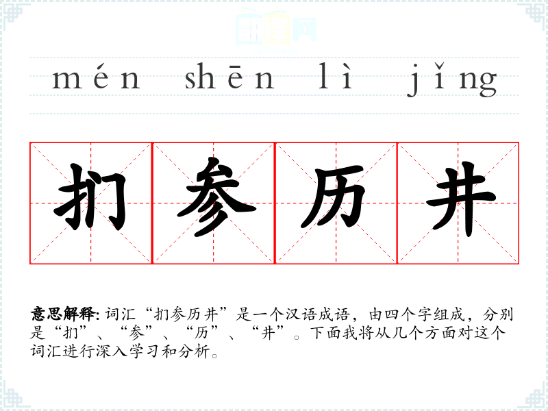 词汇“扪参历井”是一个汉语成语,由四个字组成,分别是“扪”、“参”、“历”、“井”。下面我将从几个方面对这个词汇进行深入学*和分析。