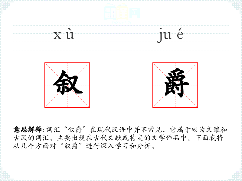 词汇“叙爵”在现代汉语中并不常见,它属于较为文雅和古风的词汇,主要出现在古代文献或特定的文学作品中。下面我将从几个方面对“叙爵”进行深入学*和分析。